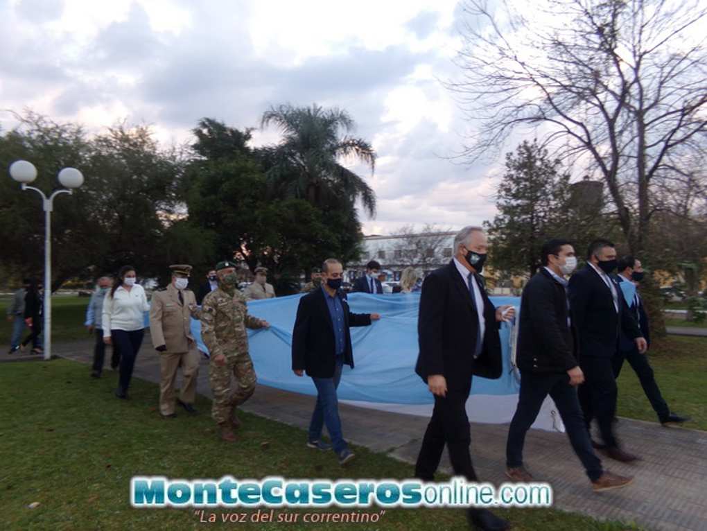 Bajo el sol naciente 08:00 horas, como estaba previsto, en la Plaza Colón, se realizó el izamiento la insignia patria ante la presencia del Intendente Miguel Olivieri, el Viceintendente Sergio Paniagua, el Diputado Juan Carlos Álvarez, funcionarios municipales, representantes del Ejército y de la Prefectura Naval Argentina.