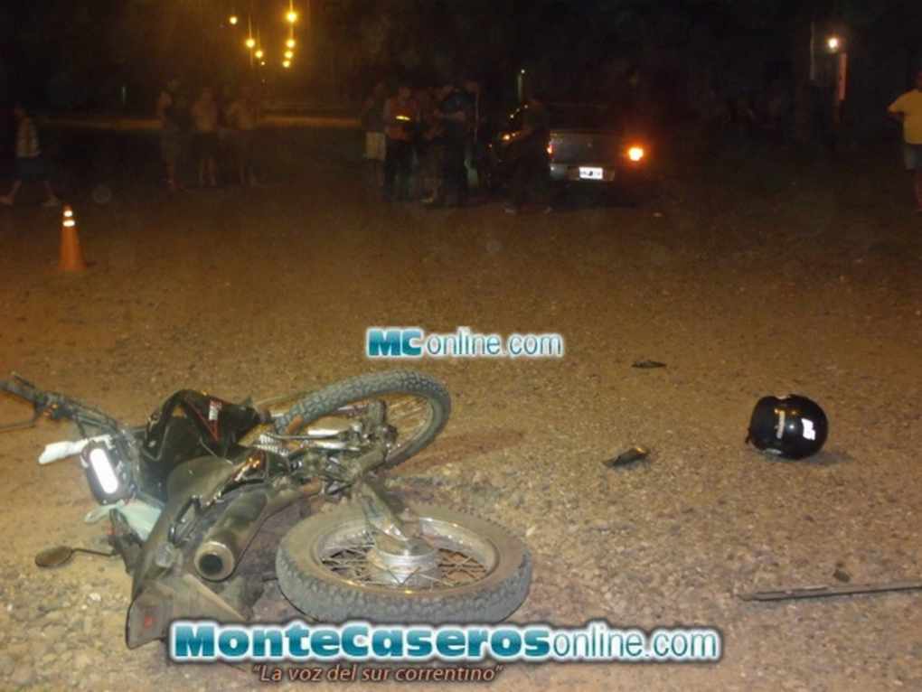 Un automóvil Chevrolet Astra chapa patente IZP 443 y una motocicleta marca Corven protagonizaron un fuerte accidente de tránsito, el hecho ocurrió en horas de la noche de este domingo, en la intersección de España y 9 de Julio. Producto del fuerte impacto el conductor del rodado menor, el cual quedó tendido sobre la calle de ripio, debió ser trasladado al Hospital para recibir atención médica. Ampliaremos
