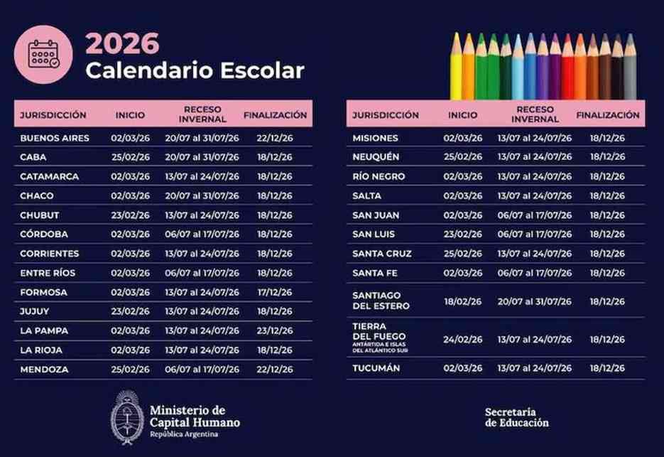 Santiago del Estero será la primera en abrir las escuelas, el 18 de febrero. La Pampa será la última en cerrar el año, el 23 de diciembre. Las vacaciones de invierno serán en julio. La Secretaría de Educación de la Nación, dependiente del Minister...