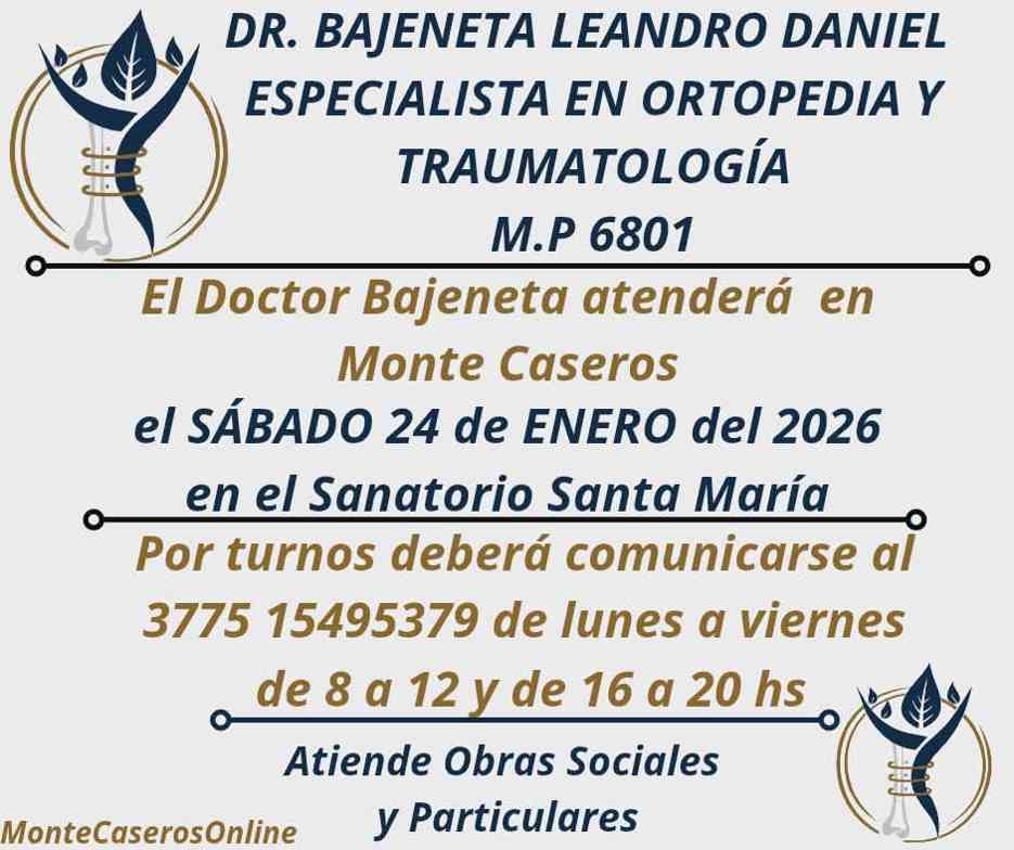 El especialista en ortopedia y traumatología estará disponible sábado 24 de enero en el Sanatorio Santa María. Se atienden obras sociales y consultas particulares. El médico traumatólogo Dr. Leandro Daniel Bajeneta (M.P. 6801) regresará a Monte Ca...