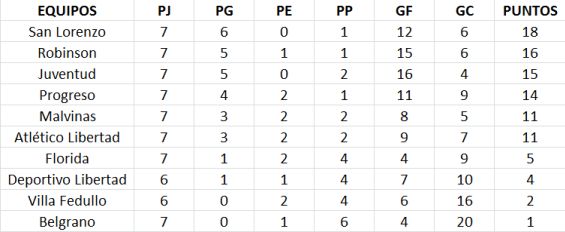Ayer en cancha del Club Atlético San Lorenzo se disputaron tres partidos, con ellos se completó la 7ma fecha. A primera hora, Malvinas venció a Deportivo Libertad por 2 a 0, continuando con la programación Juventud goleó a Villa Fedullo por 4 a 0 y se quedó con los tres puntos de la fecha, cerrando la jornada, San Lorenzo se enfrentó a Belgrano, el negro y amarillo tras vencer por 2 a 0 se ubicó en lo más alto de la tabla con 18 puntos, lo sigue su eterno rival, Samuel W Robinson (16 puntos con quien disputará el clásico en la 8va fecha.