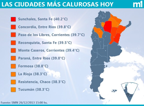 "Al día de hoy casi todo el centro y norte del país está bajo condiciones extremas de temperatura", alertó el SMN, a la vez que estimó que la situación se mantendrá en esa región "ya que no se prevé un cambio significativo de masa de aire", lo que podría originar un "récord histórico".
