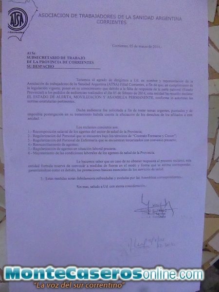 MonteCaserosOnline dialogó con el enfermero Raúl Araujo, quién nos contó acerca del encuentro y las medidas que se tomaron a partir del mismo, “en reuniones laborales surgieron conversaciones acerca de la recomposición salarial que los trabajadores de la salud no somos beneficiarios, hasta el momento. No queremos llegar al paro, pero todos buscamos un sueldo digno, el básico de un enfermero con trayectoria es de 900 pesos, es decir que para cuando se jubile no tendrá la oportunidad de cobrar un monto merecedor para vivir, en base a estas cuestiones decidimos convocar al personal del hospital a una Asamblea, de la cual también formaron parte representantes gremiales de ATSA los cuales contaron acciones que estaban haciendo para beneficiar a los trabajadores de la salud, quienes presentaron todas las documentaciones de los informes realizados para el Secretario de Trabajo, el Ministro de Salud y el Gobernador Ricardo Colombi”. “Los representantes de ATSA, efectuaron una nota en el día de ayer miércoles 5 de marzo, donde explicaban que en el mes de febrero ya se habían hecho los reclamos. En esta oportunidad se les comunicó a las autoridades provinciales de que los trabajadores de la salud estaban en alerta por una posible movilización, donde se tratarán seis puntos: 1 Recomposición salarial de los gremios de los agentes del sector de salud pública. 2 La Regularización del personal que se encuentra bajos los términos de contratos. 3 Regularización del personal de enfermería que se encuentran tercerizados. 4 Reencasillamiento de Agentes. 5 Regularizaciones de agentes en situación laborar precaria. 6 Mejoramiento de las condiciones laborales de los agentes de salud de la provincia” manifestó Araujo.