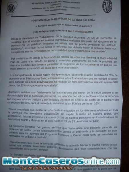 MonteCaserosOnline dialogó con Ramón Romero Secretario de Acción Social de ATSA, quién nos decía, “es la según da vez que visitamos la ciudad para apoyar a los trabajadores de la salud, primeramente se comenzó con los reclamos de salario y sobre todo ahora, que el Gobierno Provincial les mintió porque anunciaron que se les dio el 50% y en realidad es un 25% en tres cuotas, también se esta denunciando las condiciones laborales en la que se encuentran en el hospital Robinson y la persecución que están viviendo por parte de los directivos. Nosotros ahora estamos buscando un canal de diálogo y hasta el momento no conseguimos nada con la provincia”.