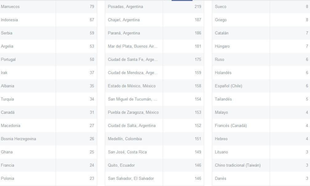 A CONTINUACIÓN COMPARTIMOS CON NUESTROS LECTORES los datos que Facebook nos brinda sobre países, ciudades y pueblos de donde a diario nos acompañan.