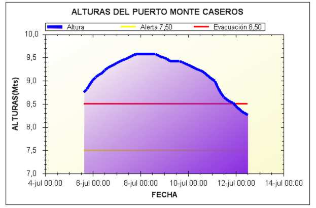 La altura del río Uruguay frente al puerto de Monte Caseros es de 8,26 metros bajando, datos de la hora 12:00 provistos a MonteCaserosOnLine por Prefectura Naval Argentina.