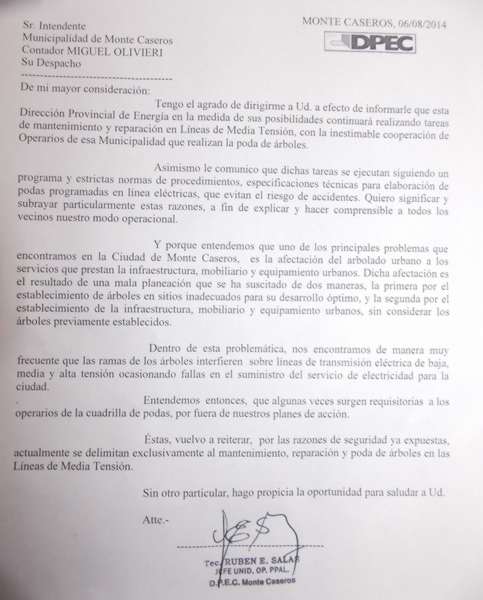 La Municipalidad de Monte Caseros informa que a raíz de un pedido efectuado por la Dirección de Energía de Corrientes (DPEC), con respecto a la poda del arbolado público, el Municipio procederá a realizar la misma sólo a solicitud de este organismo provincial y en caso que los árboles afecten el tendido de la red eléctrica.