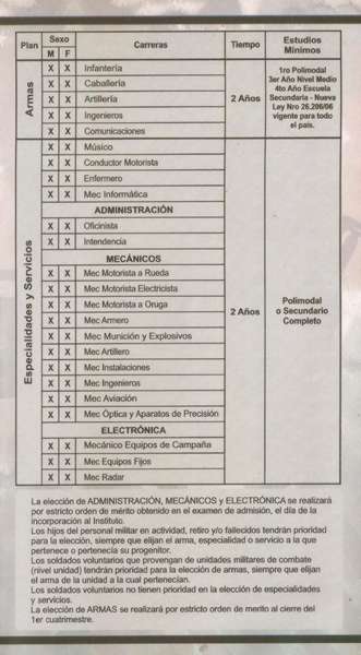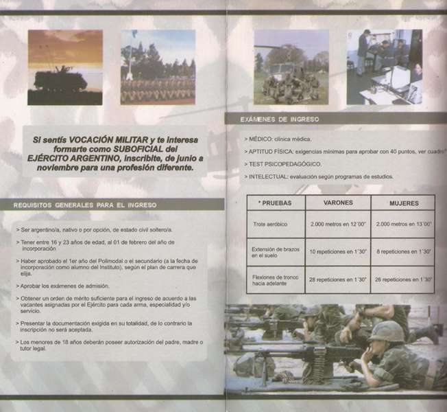 “Estamos difundiendo esta propuesta educativa para todos los jóvenes, porque muchas veces pasa que una vez que finalizan la secundaria, salen a buscar trabajo y no encuentran o ingresan en algunas empresas como contratados por tres meses y luego son expulsados para no ser blanqueados. Yo ingresé al ejército a los 15 años con un montón de dudas y miedos como puede tener cualquier adolescente, pero esta fue la mejor opción. Los chicos que recién ingresan tienen un sueldo de $3.500 y para el 2do año asciende a $6.000, es decir son ellos mismos los que se sustentan y no tiene que pedirles a sus padres, además el Ejército al ingresante le brinda, casa, ropa y comida. Lo único engorroso de todo esto es el desarraigo que sufren los jóvenes, porque muchas veces se encuentran solos y están separados de sus familias, pero dentro de la escuela hay profesionales totalmente capacitados para contenerlos en cualquier tipo de eventualidad”.