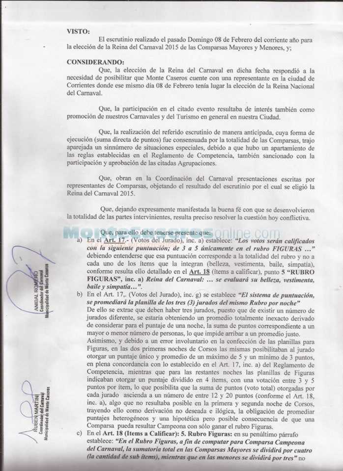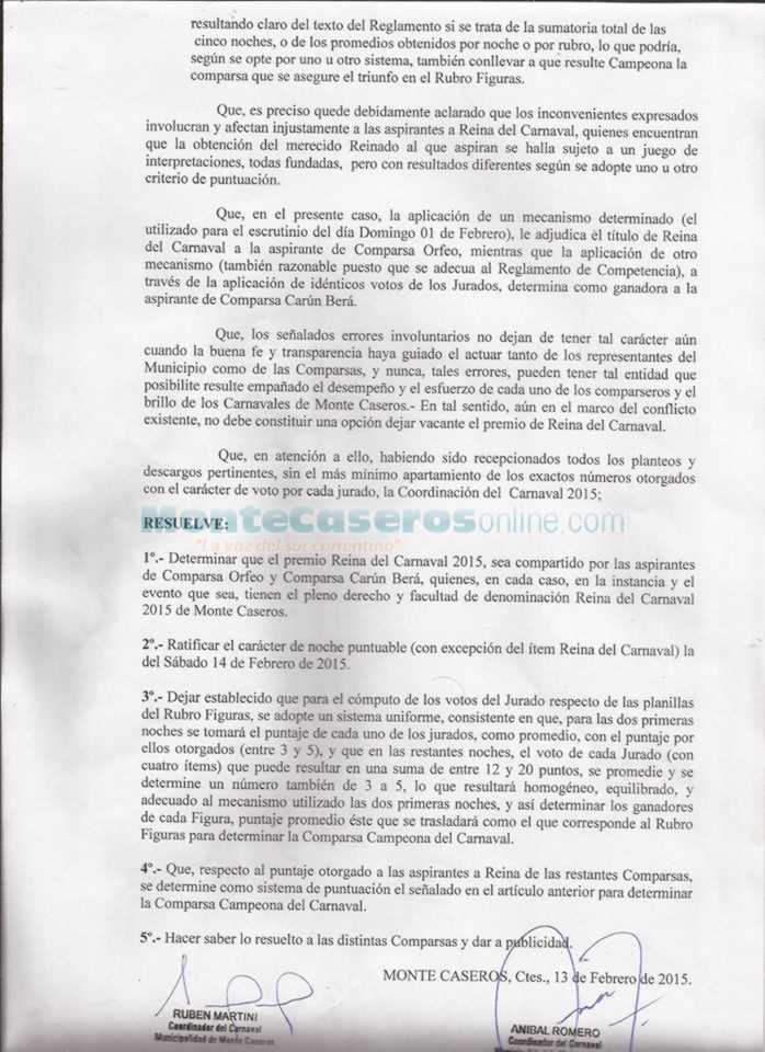 La coordinación del Carnaval resolvió 1-“determinar que el premio de Reina del Carnaval 2015, sea compartido por las aspirantes de Comparsa Orfeo y Comparsa Carún Berá, quienes, en cada caso, en la instancia y el evento que sea, tienen el pleno derecho y facultad de denominación Reina del Carnaval 2015 de Monte Caseros”