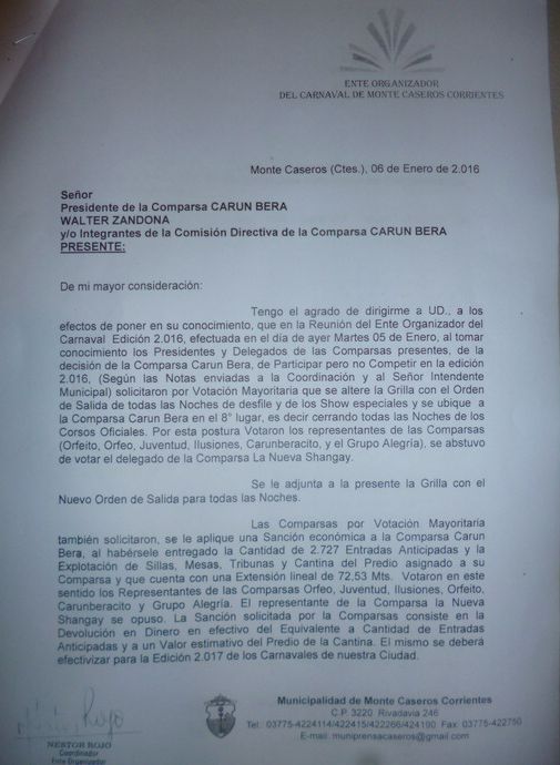“Además, el delegado de Orfeito propuso se modifique la grilla del orden salida, solicitando que Carún Berá al no competir cierre todas las noches de desfile y show especiales por una cuestión de tiempo, esto se sometió a votación y de las siete agrupaciones carnestolendas presentes solamente La Nueva Shangay no estuvo de acuerdo. Luego la presidenta de Comparsa Orfeo pidió se le aplique una sanción económica a Carún Berá ya que en el contrato que firmaron todas las comparsas, en la primera clausula se expresa que la agrupación debe participar y competir en las fechas de desfile y eventos especiales, no dice “participar y/o competir”, sino participar y competir. En clausula segunda dice que en consecuencia a lo anterior el municipio le brinda una cierta cantidad de entradas anticipadas, en este caso 2.727 y 72,53 metros lineales de predio para la explotación de mesas, sillas, cantinas, etc. Se propuso que para el 2017 devuelvan el importe de las entradas y un valor estimativo del predio y ese dinero pase a formar parte de un fondo común para las comparsas, pero que no sea utilizado para solventar gastos de la organización del carnaval. Este planteo fue sometido a votación y de las siete comparsas solamente Shangay se negó”.