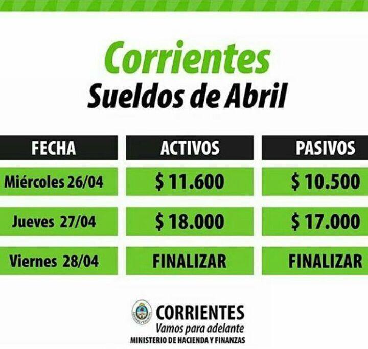 El ministro de Hacienda y Finanzas, Enrique Vaz Torres, confirmó hoy los montos por tramos del cronograma de pago del sueldo de abril, que comienza este miércoles 26, a los agentes, activos y pasivos, de la administración pública provincial. El jefe de la cartera económica informó que durante el primer día de la liquidación salarial la Provincia abonará a los activos hasta 11.600 pesos, y a los pasivos hasta $10.500; este jueves 27, cobrarán los activos hasta $18 mil y pasivos hasta $17 mil; y adelantó que finaliza el viernes 28 para ambos sectores. “Esto es posible gracias a una administración racional y equilibrada del Estado. Hoy la ciudadanía correntina puede decir elocuentemente cuáles son las administraciones que verdaderamente, y sin demagogias, protegen la calidad de vida del ciudadano”, señaló el titular del Ministerio de Hacienda y Finanzas.