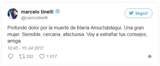 A través de su cuenta de Twitter, Marcelo Tinelli fue uno de los tantos famosos que expresó su dolor con un contundente mensaje: "Profundo dolor por la muerte de María Amuchástegui. Una gran mujer. Sensible, cercana, afectuosa. Voy a extrañar tus consejos, amiga".