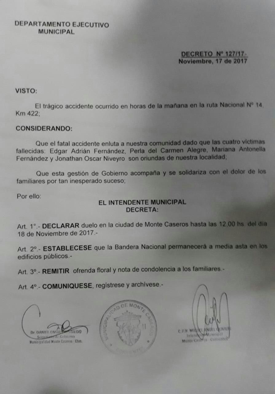 El Intendente Miguel Olivieri decretó un día de duelo, el que regirá hasta las 12:00 horas de este sábado 18, por la tragedia vial ocurrida en el kilómetro 422 de la ruta Nacional 14 que se cobró la vida de cuatro montecasereños.