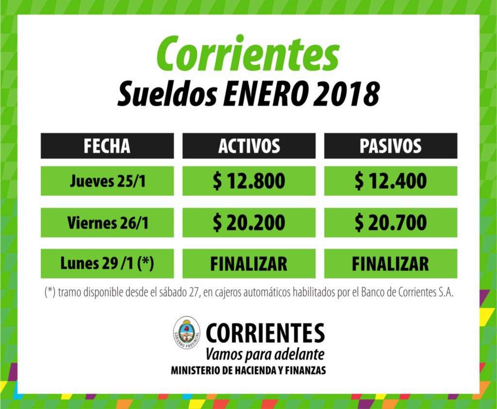 Entre el 25 y 29 Provincia paga enero y vuelca más de $1.550 millones a la economía local  Tras el anuncio del gobernador Gustavo Valdés, el primer mandatario provincial y el jefe de la cartera económica Enrique Vaz Torres confirmaron hoy, que este jueves 25 cobrarán sus haberes de enero los agentes activos que perciban hasta 12.800 pesos, y los pasivos hasta $12.400; el viernes 26, activos hasta $20.200, y pasivos hasta $20.700; y el cronograma finaliza el lunes 29. “Este último tramo estará disponible el sábado 27, a través de los cajeros automáticos del Banco de Corrientes SA”, afirmó el ministro Vaz Torres.