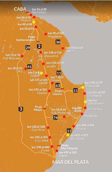 Para los traslados hacia la costa atlántica bonaerense, se distribuyeron por los diferentes caminos y accesos más de sesenta equipos preparados para detectar los excesos de velocidad. Fueron instalados por el gobierno provincial hace una década en tenor a la adecuación de la ley de tránsito. A los cinemómetros (los instrumentos que miden en tiempo real la velocidad de un vehículo) repartidos por los sectores más críticos de las rutas 11, 36 y 215 y también en la Autovía 2 y la autopista que une la Ciudad con La Plata, deben agregarse los controles instalados por las comunas de Chascomús, Dolores, General Madariaga, Lezama y Mar Chiquita. El camino de Buenos Aires a Mar del Plata está fiscalizado por once radares entre nacionales, provinciales y municipales. La circulación por la ruta once que recorre todo el Partido de la Costa (los 200 kilómetros que separan a San Clemente del Tuyú de Santa Clara del Mar) se encuentra con otros siete puntos de control.