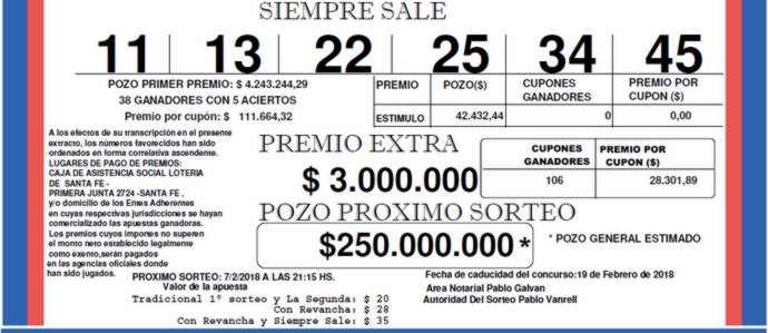 Un apostador montecasereño ganó el Quini 6 en la modalidad "Siempre Sale” y se llevará la suma de $111.664,32 (Ciento once mil seiscientos sesenta y cuatro, con treinta y dos) con los números 11, 13, 22, 25, 34 y 45.