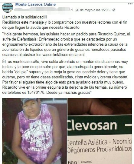 Entrevista Representantes del Dispensario “Vicente Mendieta” cuentan acerca de la situación de salud de un joven montecasereño  A raíz de una publicación realizada por nuestro medio vía Facebook el día sábado 26 de mayo y la cual se viralizó en las redes sociales, acerca de un llamado a la solidaridad para donación de insumos farmacéuticos para Ricardo Quizóz, un joven montecasereños que padece la enfermedad de Elefantiasis.