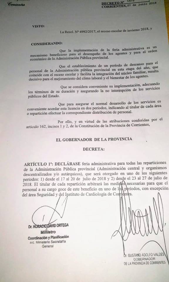 Gustavo Valdés firmó el decreto que fija la feria administrativa para los empleados de la administración pública provincial, la misma será del 17 al 20 y del 23 al 27 de julio. Cada jefe de área deberá coordinar con su personal a cargo el descanso en un turno y en uno de los períodos establecidos.