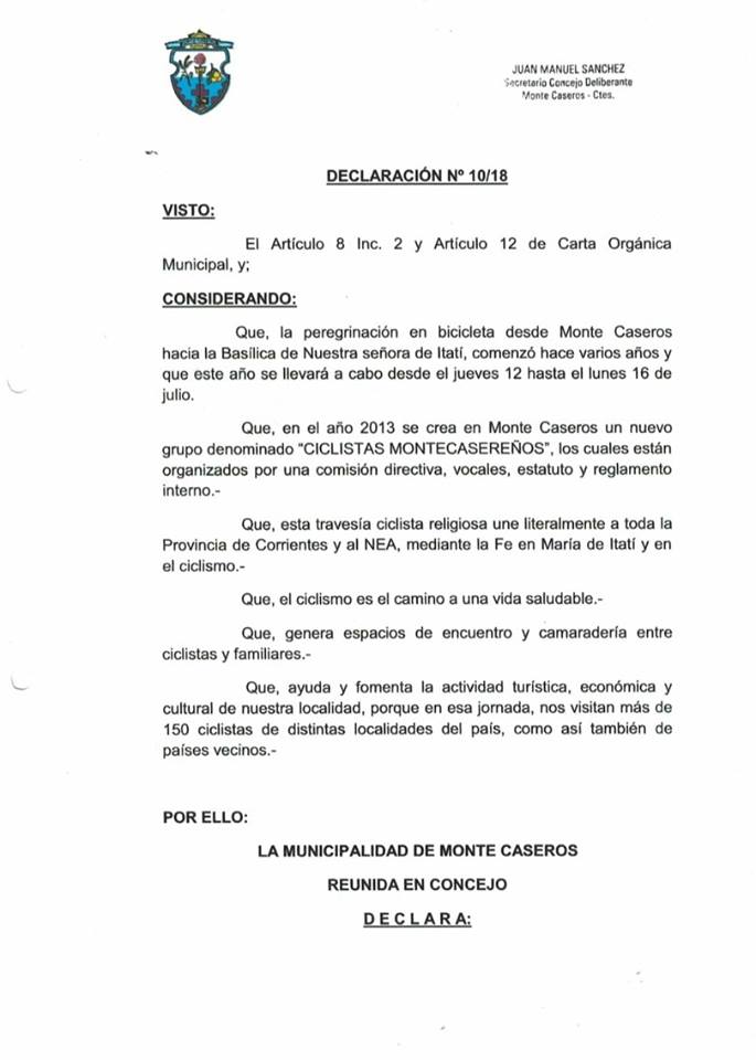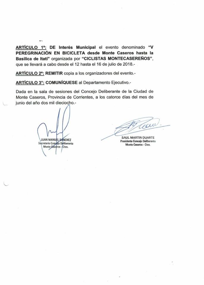 El Concejo Deliberante de Monte Caseros declaró de Interés Municipal la “V Peregrinación en Bicicleta desde Monte Caseros hasta la Basílica de Itatí organizada por Ciclistas Montecasereños que se realzará desde el 12 al 16 de julio.
