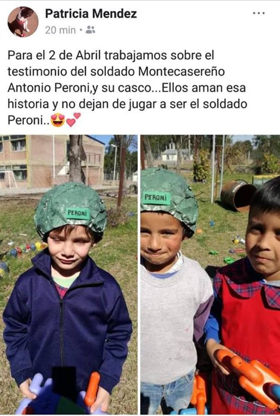 Su maestra, Patricia Mendez publicó en su cuenta de Facebook una foto de los pequeños y junto a ella una descripción: “Para el 2 de Abril trabajamos sobre el testimonio del soldado Montecasereño Antonio Peroni y su casco… ellos aman esa historia y no dejan de jugar a ser el soldado Peroni”, esta publicación fue conocida por nuestro medio a través de Luciano, hijo del héroe montecasereño, y bajo la premisa de hónralos todos los días, la quimismo compartir.