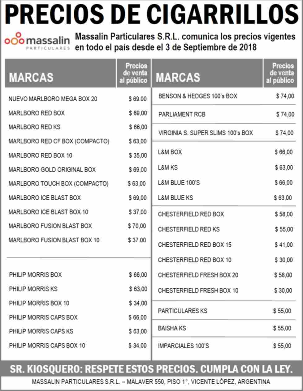 Como consecuencia de este nuevo aumento, los atados de cigarrillos tendrán un valor entre $5 y $3 más. De esta manera, el Marlboro Box de 20 unidades pasará de costar 66 pesos a 69, en tanto que la versión KS costará 66 pesos. Por el box 10 habrá que pagar 35 pesos, con una novedad en la lista de una nueva versión dentro de la marca llamada megabox.