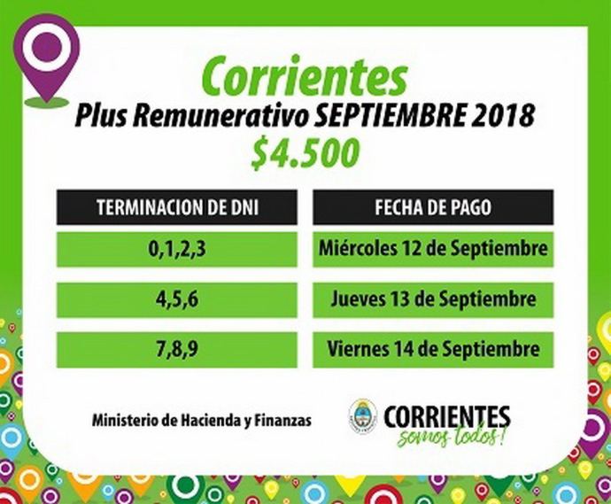 El gobernador Gustavo Valdés anunció hoy, a través de su cuenta de twitter (@gustavovaldesok), el inicio del pago del plus remunerativo de $4.500 correspondiente a septiembre y confirmó que se abonará a partir del miércoles 12 y en tres días. En este sentido, el ministro de Hacienda y Finanzas, Enrique Vaz Torres, afirmó que el monto de inversión que realiza la Provincia en este beneficio asciende a $360 millones. El pago del plus mensual remunerativo de septiembre comenzará el miércoles 12, día en el que percibirán los agentes con Documento Nacional de Identidad terminados en 0, 1, 2 y 3; la liquidación continuará el jueves 13, jornada en la que percibirán aquellos con DNI terminados en 4, 5 y 6; y la liquidación del cronograma finalizará el viernes 14, confirmó el jefe de la cartera económica, para beneficiarios con Documentos terminados en 7, 8 y 9.