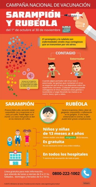 Del 1 de octubre al 30 noviembre Lanzan la campaña nacional de seguimiento contra el sarampión y la rubéola  La vacunación "es la estrategia más efectiva para prevenir", subrayaron las autoridades sanitarias que apuntan a través de ésta iniciativa a evitar rebrotes de las enfermedades.