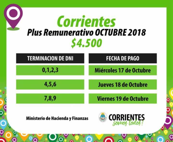 El gobernador de la provincia, Gustavo Valdés, a través de su cuenta de Twitter, confirmó el cronograma de pago del plus extraordinario de $4500 para la administración pública. Comienza a pagarse el día miércoles 17 de octubre, con terminación de DNI 0, 1, 2 y 3. Continuará el jueves 18 (DNI, 4, 5 y 6) y finaliza el viernes 19 (DNI 7, 8 y 9).