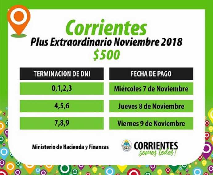 En la mañana de hoy, el gobernador de la Provincia, Gustavo Valdés, confirmó -a través de su cuenta oficial de Twitter (@gustavovaldesok)- el pago del plus extraordinario de $500 correspondiente al mes de Noviembre desde el miércoles 7, por terminación de número de documento. Tras el anuncio, el ministro de Hacienda y Finanzas, Enrique Vaz Torres, destacó que el pago de este extra, que llega a la totalidad de agentes activos y jubilados, significa una inversión adicional mensual por parte de la Provincia del orden de los $40 millones. El pago del plus extraordinario no remunerativo se iniciará este miércoles 7, día en el que percibirán el adicional los agentes con números de Documento Nacional de Identidad terminados en 0, 1, 2 y 3; continúa el jueves 8, para quienes tengan sus D.N.I. finalizados en 4, 5 y 6; en tanto que el cronograma termina el viernes 9 para el resto de los beneficiarios. El pago se liquida en articulación con el Banco de Corrientes S.A.