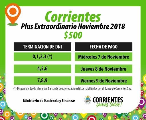 El cronograma continúa el jueves 8, para quienes tengan sus D.N.I. finalizados en 4, 5 y 6; en tanto que el cronograma termina el viernes 9 para el resto de los beneficiarios. El pago se liquida en articulación con el Banco de Corrientes S.A.