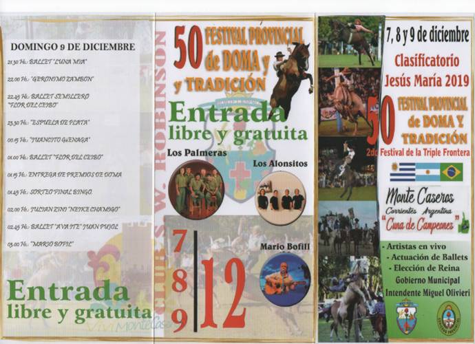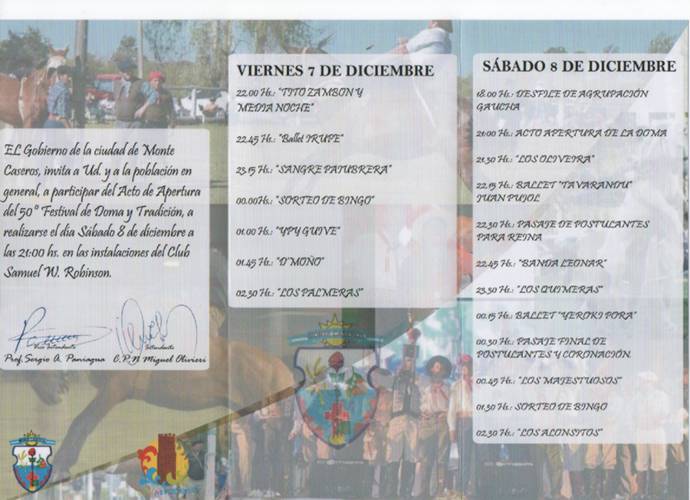 El Gobierno de la ciudad de Monte Caseros invita a la población en general, a participar del Acto de Apertura del 50 “Festival de Doma y Tradición” a realizarse el sábado 8 de diciembre a las 21:00 horas, en las instalaciones del Club Samuel W. Robinson.