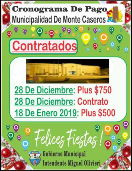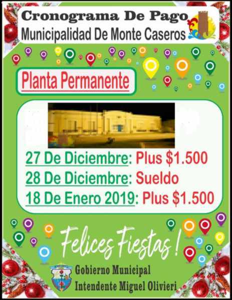 La Municipalidad de Monte Caseros paga sueldos correspondiente al mes de diciembre, a empleados de planta permanente y contratados.