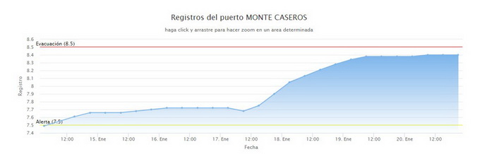 Garruchos 4,88 baja Santo Tomé 687 estacionado Alvear 8,86 crece La Cruz 9,13 crece Yapeyú 8,78 crece Paso de los Libres 8,77 evacuación estacionado Bompland 8,54 alerta estacionado Monte Caseros 8,4 alerta estacionado Mocoretá 11 alerta crece