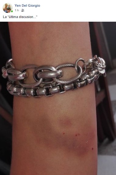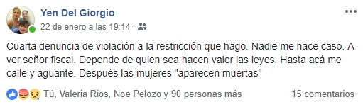 A través de su cuenta de Facebook Yenhy del Giorgio denunció públicamente a su ex pareja. “Cuarta denuncia de violación a la restricción que hago. A ver señor fiscal. Depende de quién sea hacen valer las leyes. Hasta acá me calle y aguate. Después las mujeres “aparecen muertas” escribió en las redes sociales