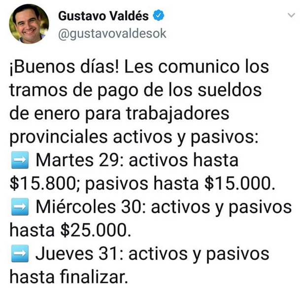 El gobernador Gustavo Valdés confirmó hoy los montos por tramos del cronograma de pagos de los haberes de Enero desde este martes 29. Con la liquidación de los sueldos de este mes la Provincia vuelca cerca de $2.000 millones en la inversión mensual en el ingreso de los agentes públicos.