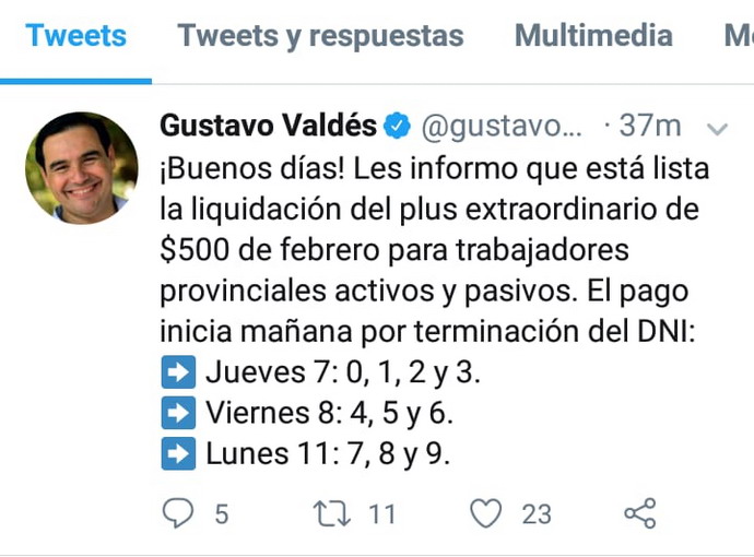 El Gobernador de la Provincia de Corrientes, Gustavo Valdés, anuncio a través de su Twitter que este jueves 7 de febrero inicia el pago del Plus de $500.