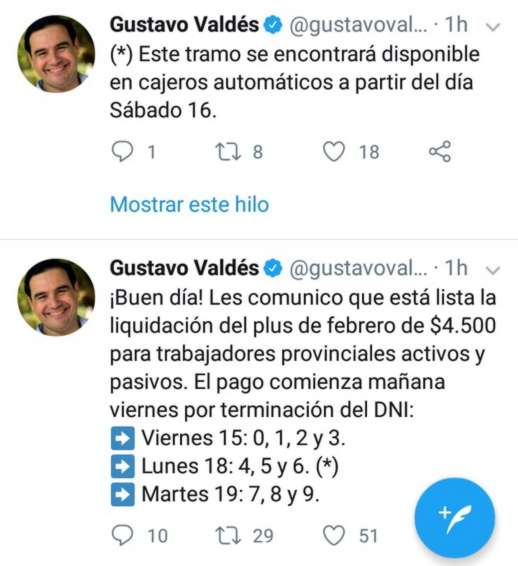 El gobernador Gustavo Valdés anunció hoy, a través de su cuenta de twitter (@gustavovaldesok), el inicio del pago del plus remunerativo de $4.500 correspondiente a febrero; confirmó que se abonará a partir del viernes 15 y en tres días.