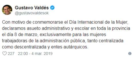 A través de sus redes sociales el gobernador de la provincia, Gustavo Valdés, anunció que "con motivo de conmemorarse el Día Internacional de la Mujer de claramos asueto administrativo y escolar en toda la provincia el 8 de marzo".