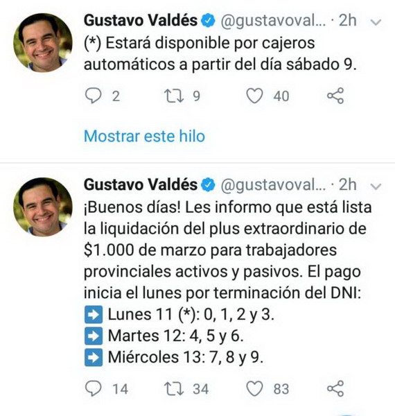 El gobernador, Gustavo Valdés, confirmó hoy a través de su cuenta oficial de Twitter (@gustavovaldesok), el cronograma de pago del adicional, también la decisión que el hasta ahora plus extraordinario de $500 pase a ser remunerativo y además aumente a $1.000 a partir de este mes, para todos los estatales activos y jubilados.