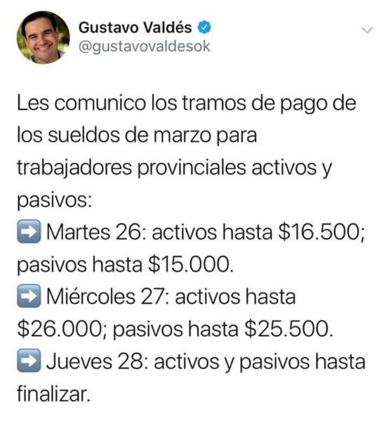 El gobernador Gustavo Valdés dio a conocer hoy, el cronograma salarial correspondiente al mes de marzo a través de su cuenta de twitter para los empleados públicos, tanto para pasivos como activos. Arranca este martes 26 con los salarios de hasta $16.500 para los activos y 15.000 en pasivos.