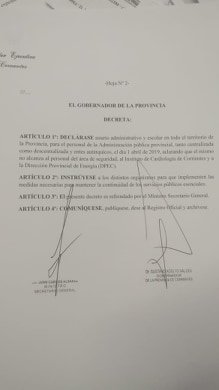 Artículo 1: Declárese asueto administrativo y escolar en todo el territorio de la Provincia, para el Personal de Administración Pública provincial, tanto centralizada como descentralizada y entes autárquicos, el 1 de abril de 2019, aclarando que el mismo no alcanza al personal del área de seguridad, al Instituto Cardiológico de Corrientes y a la Dirección Provincial de Energía (DPEC).