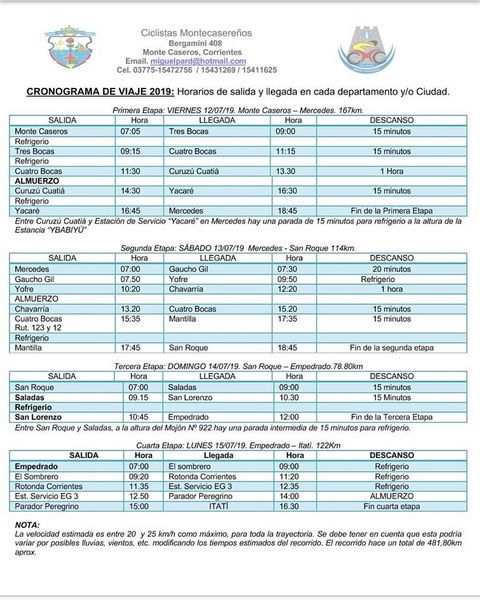 Según el cronograma, los ciclistas montecasereños partirán mañana 12 de julio a las 07:05 horas. La actividad fue declarada nuevamente de Interés Municipal, por el Honorable Concejo Deliberante de nuestra ciudad, mediante la Declaración Nº07/19