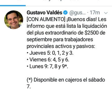 Con un aumento, el adicional de $2.500 comenzará a pagarse este jueves 5 a los DNI terminados en 0, 1, 2 y 3, así lo anunció el Gobernador Gustavo Valdés a través de sus redes sociales, para todos trabajadores de la administración pública.