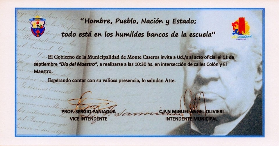 El Gobierno de la Municipalidad de Monte Caseros invita a la población a participar de la ceremonia que se tendrá lugar este miércoles 11 de septiembre a las 10:30 horas en la intersección de Colón y El Maestro, donde se halla emplazado el monumento de “Domingo F. Sarmiento”.