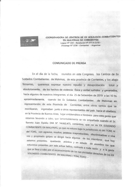 Carlos Enriori, Presidente del Centro “Avá Ñaró” envío a MonteCaserosOnLine una nota que a continuación compartimos con nuestros lectores, en la que repudian el accionar que tuvo un masculino en la manifestación llevada a cabo el pasado 25 de septiembre en la Provincia de Buenos Aires. “En el día de la fecha, reunidos en este Congreso, los Centros de Ex Soldados Combatientes de Malvinas, de esta Provincia de Corrientes y los abajo firmantes, queremos expresar nuestro repudio y desaprobación total y absolutamente, de los hechos de violencia física y verbal sufridos y generados, hacia algunos de nuestros integrantes el día 25 de septiembre de 2019 a las 10:00 horas aproximadamente, cuando los Ex Soldados Combatientes de Malvinas en representación de esta Provincia de Corrientes, entre otros tantos que se movilizaron, ingresaban junto a otros representantes del país hacia el Obelisco, en la Provincia de Buenos Aires, lugar emblemático e histórico para esta gesta que estamos llevando a cabo, que lamentablemente se vio empañada cuando el señor Barreto Juan Elpidio correntino, que no es EX SOLDADO COMBATIENTES EN MALVINAS, ya que no estuvo bajo la jurisdicción ni del TOM, ni del TOAS, con agravioa, insultos, palabras irreproducibles, discriminativas a viva voz y propinando golpes se dirigió hacia algunos de los miembros que hoy estamos presentes, quedando atónitos y en estado de asombro los que estuvimos presentes por este actuar bélico, contrario a toda razón y a la gesta que se lleva a cabo por el reconocimiento de los tan olvidados derechos de los EX COMBATIENTES EN MALVINAS (TOM,TOAS).”
