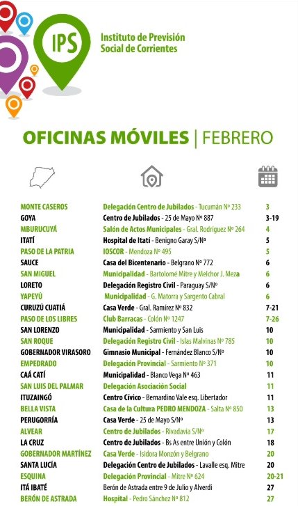 El Instituto de Previsión Social (IPS) volverá en febrero al interior con las oficinas móviles, sistema mediante la cual se posibilita a la población el acceso a trámites referidos al sistema jubilatorio provincial de manera personal y evitar así traslados a la Capital. La actividad arrancará el 3 de febrero en las localidades de Monte Caseros y Goya. En total, se visitarán 29 localidades el próximo mes.