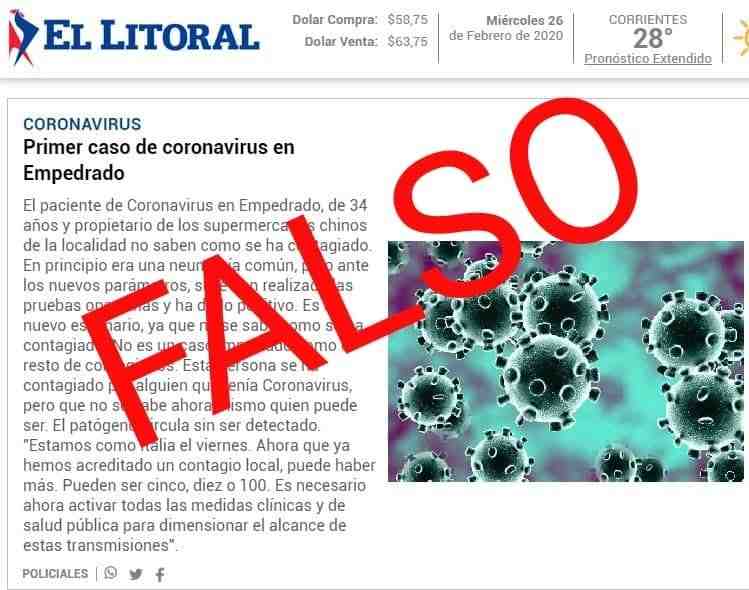 En las últimas horas comenzó a circular a través de diversos medios la imagen de una supuesta captura de pantalla de la página web de El Litoral con dicha información. Se trata de un intento de engaño, efectuado por quien -escondido en el anonimato- pretende perjudicar a la población en general con datos falsos.