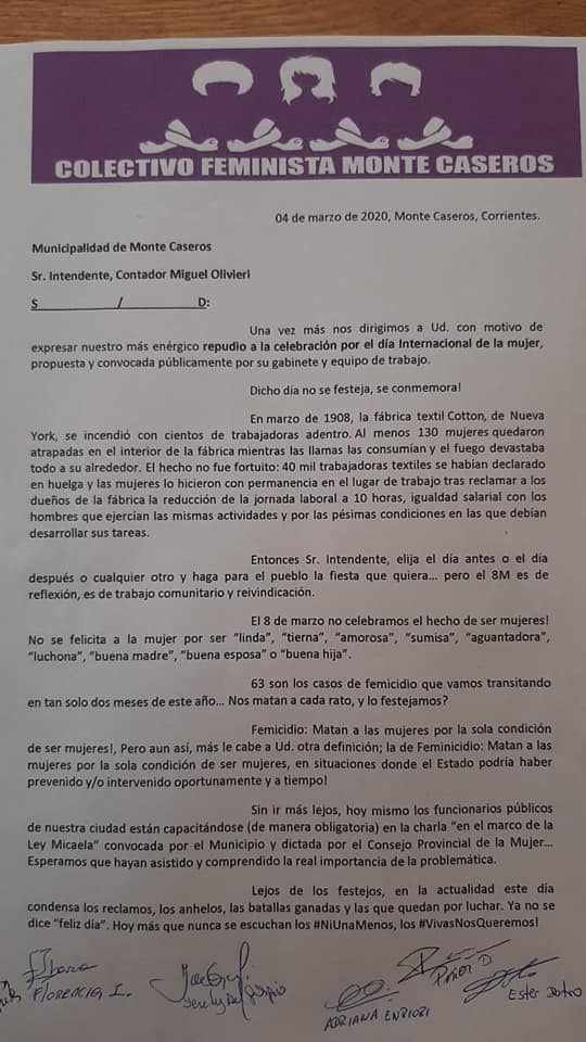 El colectivo feminista de Monte Caseros emitió una carta dirigida al Intendente Municipal, Miguel Olivieri, en la que expresan su repudio a la celebración por el Día Internacional de la Mujer propuesta y convocada por el gabinete.