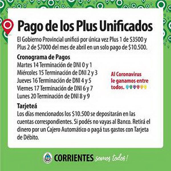 Tal como se había anunciado, este martes comienza el pago unificado de los plus 1 y 2 correspondientes al mes de abril para activos y pasivos de la administración pública, cuyos montos suman 10.500 pesos.