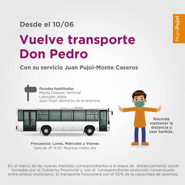 El servicio de trasporte Don Pedro realizará su recorrido Monte Caseros- Juan Pujol, a partir de este miércoles 10, con las medidas de seguridad e higiene que exige el protocolo: manteniendo la distancias y el uso obligatorio del barbijo, ocupando solamente el 50% de su capacidad.